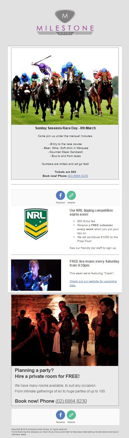 Milestone Hotels - Leichhardt; Kingswood; DubboWe had already engaged another web designer, but months later we were still waiting on a result – and weren’t happy when it finally came. We do a lot for our customers – special events; live music; competitions – not to mention the great function facilities we have in our heritage building. Tim assessed the old website, and launched a brand new one within the first month. It showcases all that we do, and stays fresh as new things come up.